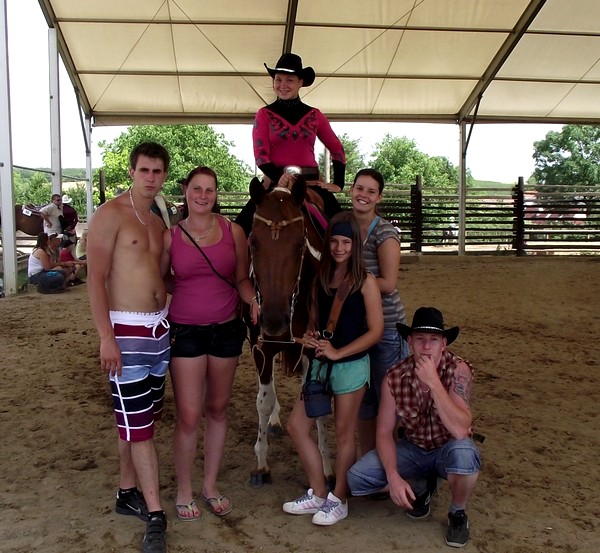 V roce 2010 se žádné závody nekonaly,jak na statku,tak jsme se s koníky ani nikam nevydali.V roce 2011 už to bylo o něco lepší,v červenci se jelo do Židovic - Joeannka s Andý.Účastnit se měla v plánu i Ája,ale Lucky (už není na statku,prodán.) bohužel okulhal.Jeli jsme skoro celá grupa - Lenka,Andý,Andrejka,Áďa,Pája a Dáda, už ráno,ale závodili jsme až odpoledne a vedro nás pomalu zmáhalo,ale všichni jsme to dali:).Andý s Joi si odvezli krásné 3 místo v pleasure open,možná by bylo umístění i v Mládeži "D",ale Joi si trošku vyhodila z kopýtka,takže neumístěno.V horsemanshipu vše proběhlo tak,jak mělo,dokud nedošlo na couvání..Joei se to asi moc nelíbilo a couvala do všech stran,tak si ji Andy vzala obouruč a odjela to alespoň treninkově:).Každopádně z toho měly obě závodnice(nevíme jak Joi,ale Andý určitě) dobrý pocit,hlavně protože to byly její první závody.Příští rok si chce udělat licenci a jezdit už konečně i s Andrejkou,takže uvidíme jaká bude sezona 2012:)
